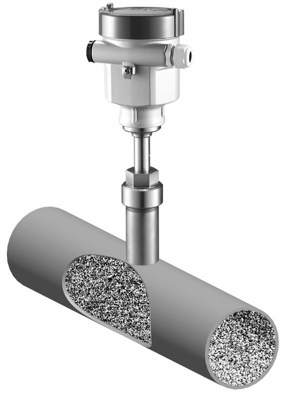 微波固體流量計用來測量在金屬管道中輸送的粉/顆粒狀固體物料的流量。傳感器向管道中發(fā)射低能量微波信號,能量被流動的粉/顆粒狀物料散射并被傳感器接收。根據(jù)多普勒原理,由移動的物體反射的回波與發(fā)射波在頻率上有頻差,此頻差與物料的流速成正比,因此可以測量出物料的流速;通過移動物料反射的微波能量可測量物料的密度,從而測量出物料的流量。