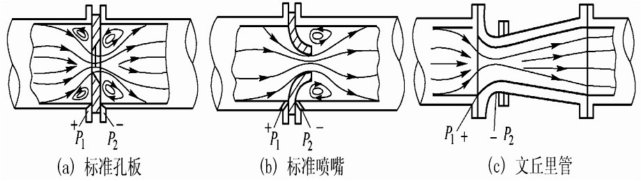流體流經(jīng)節(jié)流件時,流束收縮引起壓頭轉(zhuǎn)換而在節(jié)流件前后產(chǎn)生靜壓力差,該壓差與流過的流量之間存在一定的關(guān)系,通過測量壓差而求出流量的一種流量計通稱節(jié)流裝置,也稱為差壓裝置。節(jié)流裝置結(jié)構(gòu)簡單,性能穩(wěn)定,使用維護(hù)方便,且有一部分已標(biāo)準(zhǔn)化,是目前應(yīng)用最多的一種流量計。常用標(biāo)準(zhǔn)節(jié)流裝置有孔板、噴嘴及文丘里管,如下圖所示。