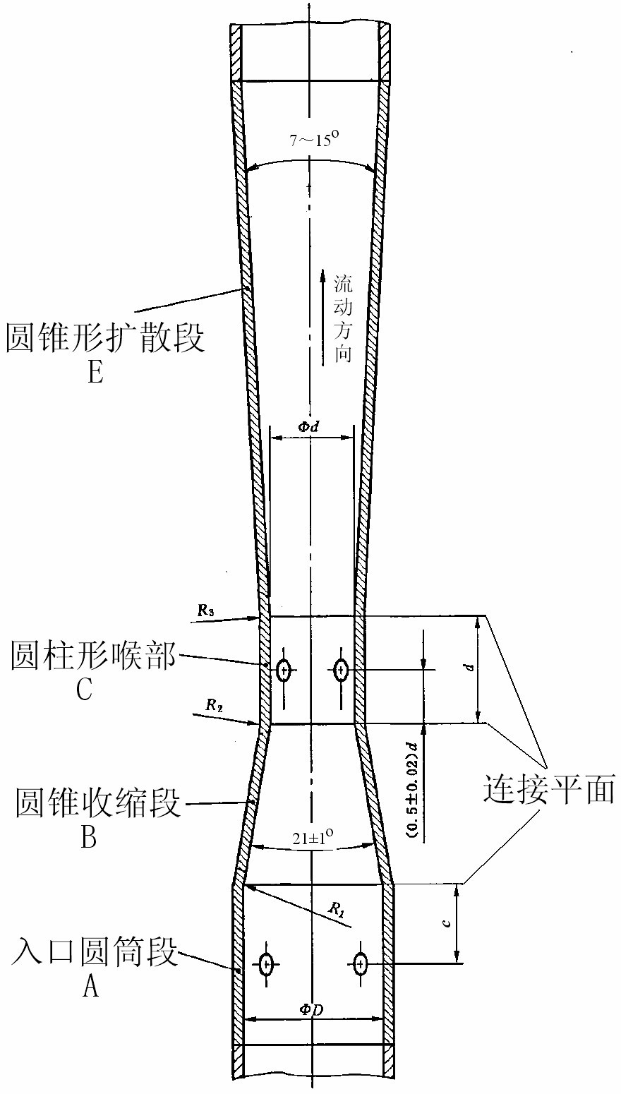 標準文丘里管有兩種形式: 古典文丘里管(簡稱文丘里管,見圖)與文丘里噴嘴。文丘里管是由入口圓筒段A,流量計圓錐收縮段B,圓柱形喉部C以及圓錐形擴散段E組成。文丘里管內(nèi)壁是對稱于軸線的旋轉(zhuǎn)表面,該軸線與管道同軸。
