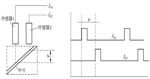 光纖渦輪流量計兩個反射型光纖傳感器被并列裝配在渦輪流量計上,這兩個傳感器可檢測同一渦輪葉片不同位置的反射信號fo1與fo2,這兩個傳感器信號與流體流量成正比(fo1=KQ,fo2=KQ),互不干擾,相位差為j,如圖所示。通過檢測電路得到流體流量,且可實現(xiàn)雙向測量。