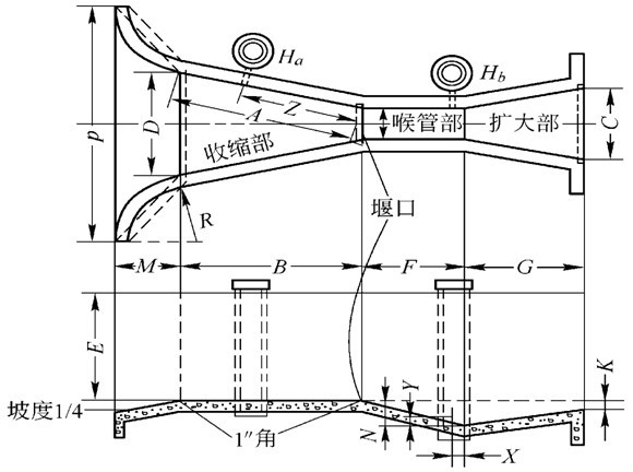 槽式流量計(jì)是在明渠水路中采用節(jié)流方法來測(cè)量流量的特殊測(cè)流槽,在節(jié)流的部位,水的流速增大,水位下降。測(cè)量由此產(chǎn)生的水位變化可以確定流量。水路節(jié)流的方式甚多,其中應(yīng)用最廣泛的是巴歇爾(Pareshall)水槽,如下圖所示。