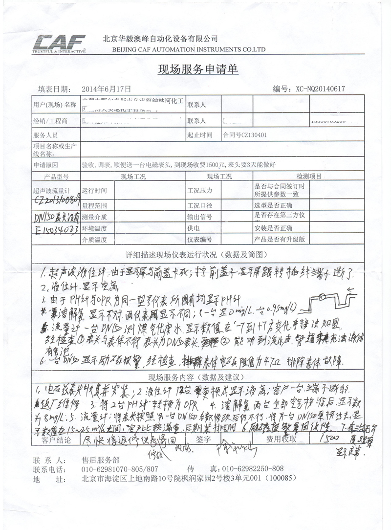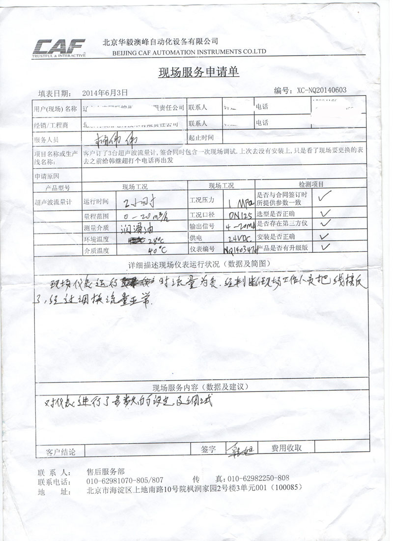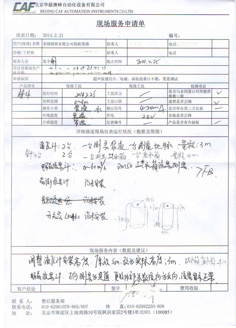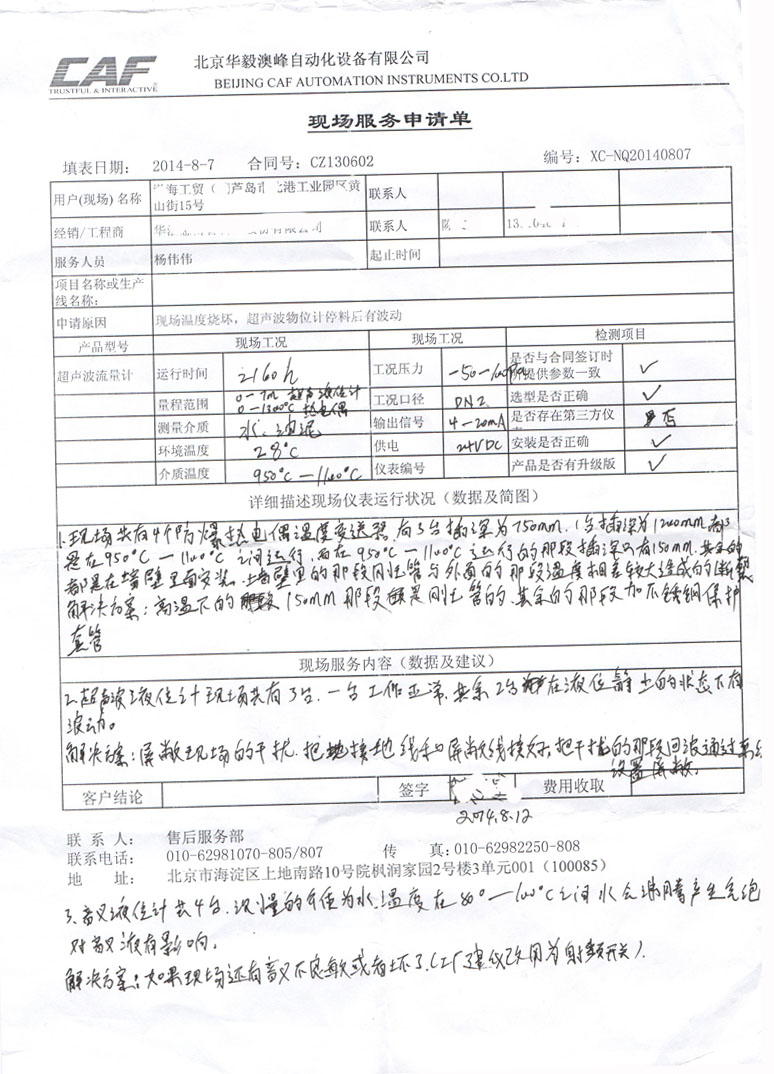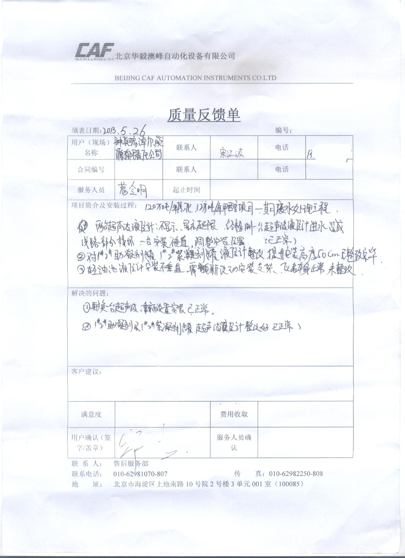 超聲波液(物)位計質(zhì)量反饋單