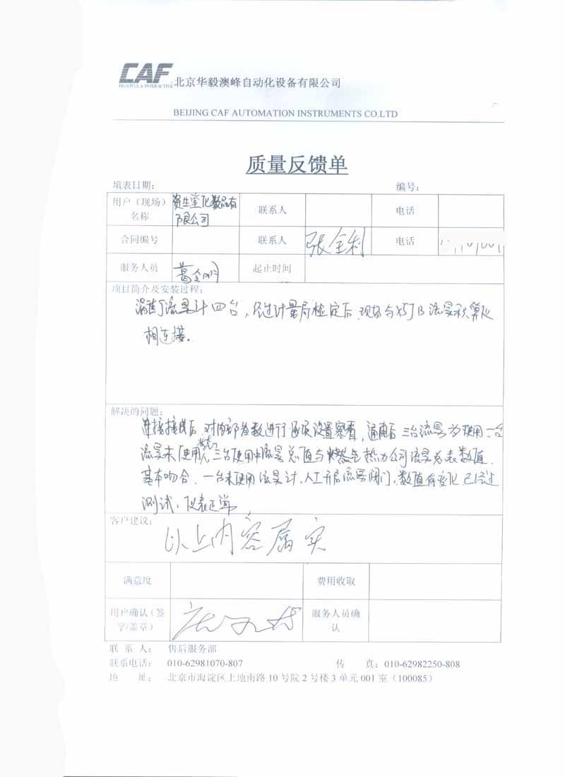 渦街流量計(jì)質(zhì)量反饋單